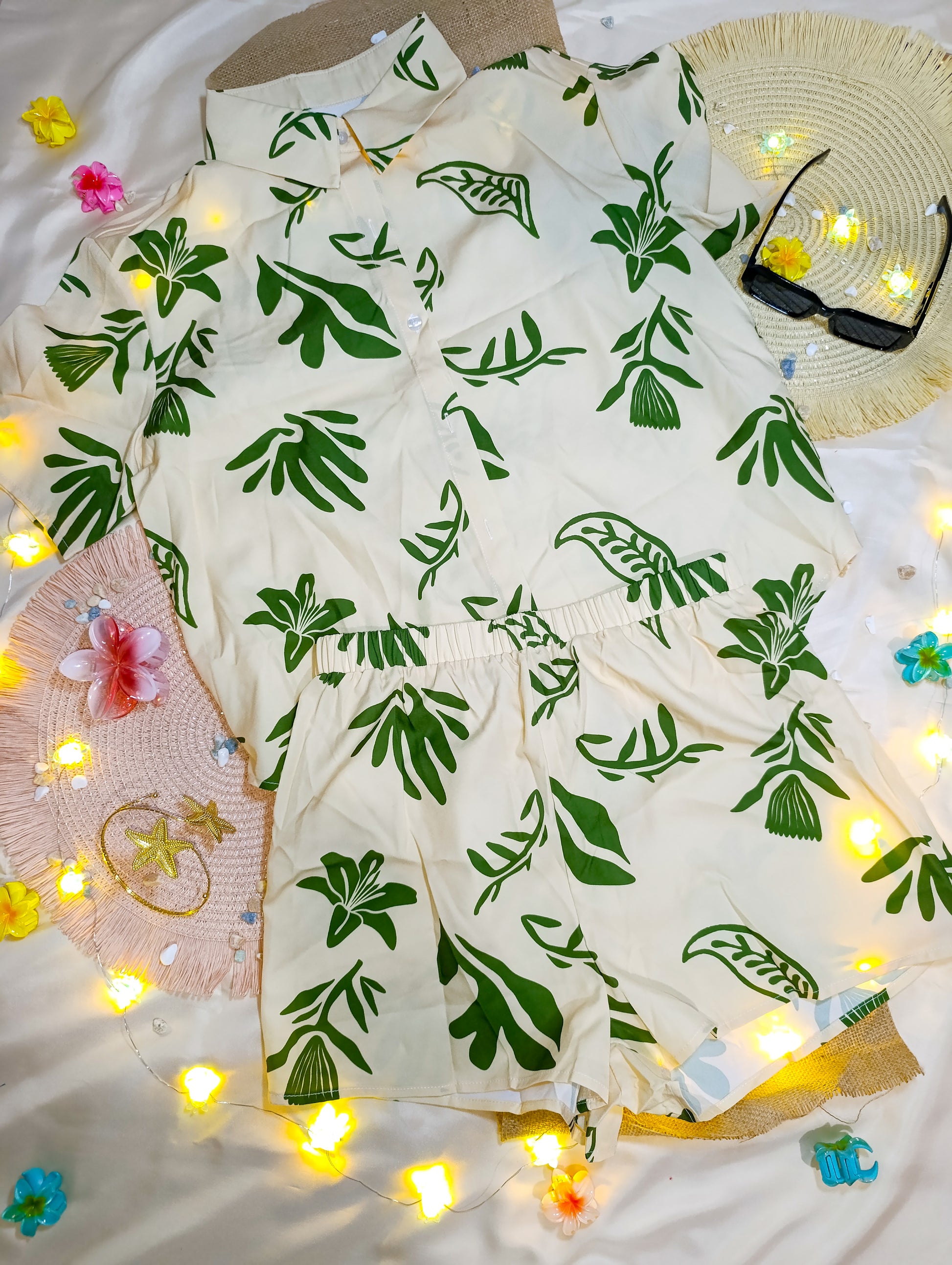 El Conjunto Alga es sinónimo de comodidad y elegancia tropical. Su diseño relajado y su estampado botánico lo convierten en la elección ideal para días de descanso con mucho estilo.