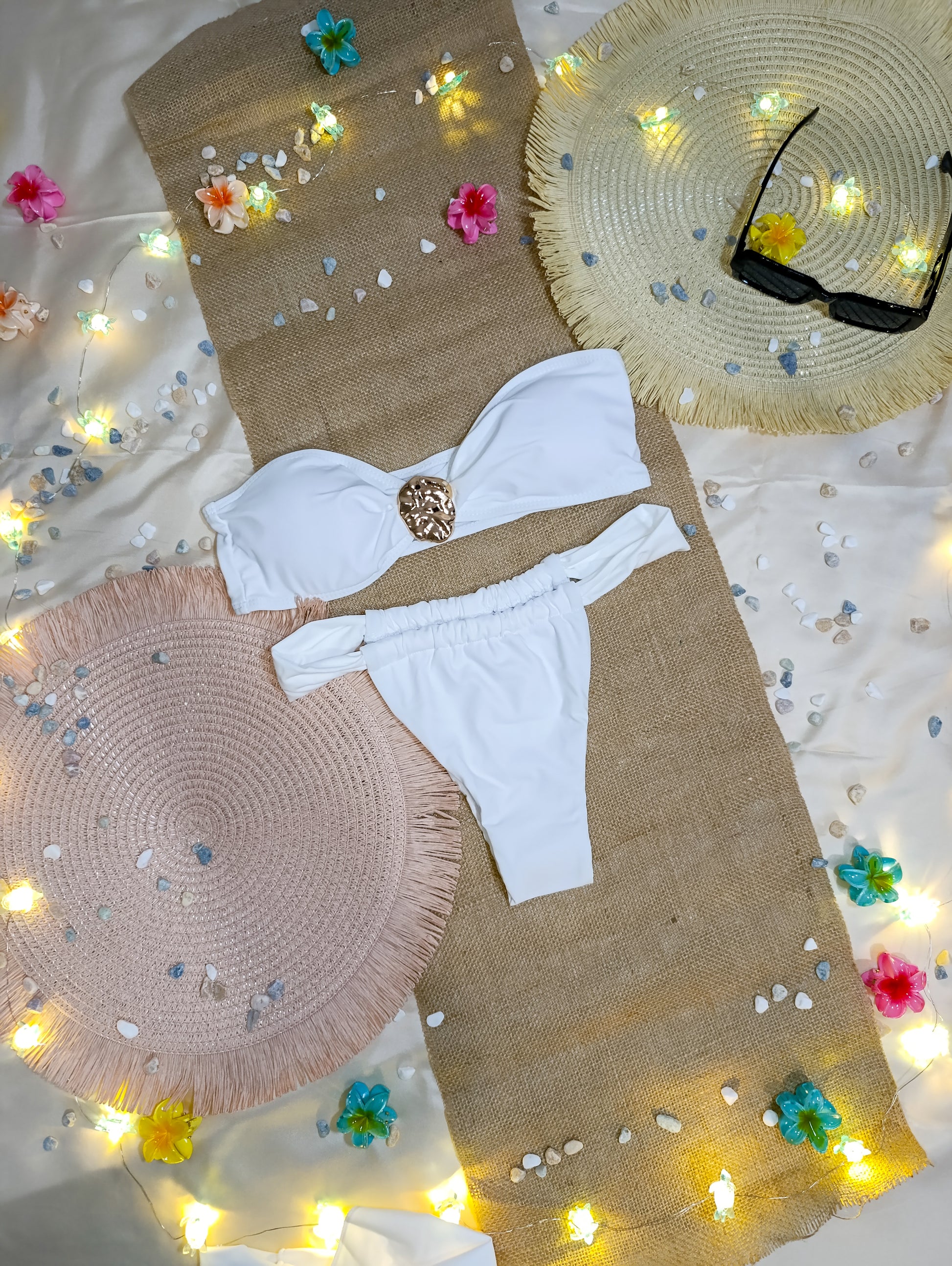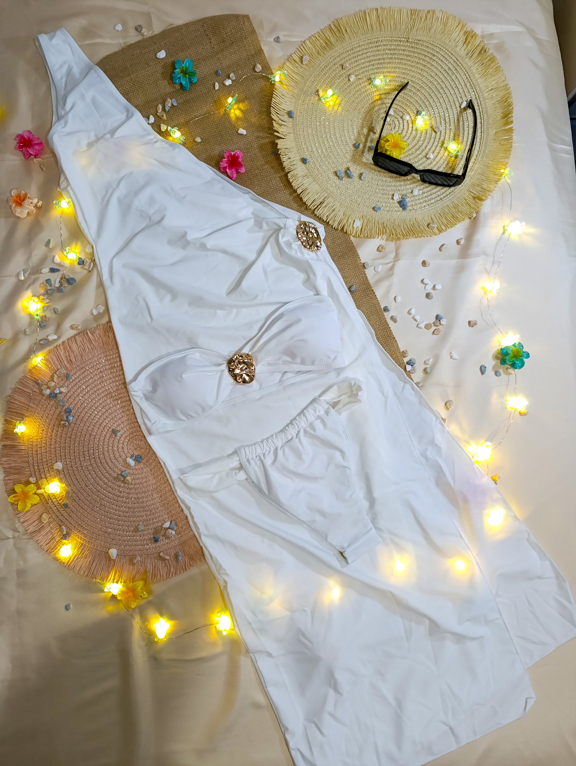 El Set Luna es un conjunto de 3 piezas diseñado para mujeres que desean lucir sofisticadas sin renunciar a la comodidad y protección. Su tono blanco puro y acabados dorados lo convierten en una joya para los días de sol.
