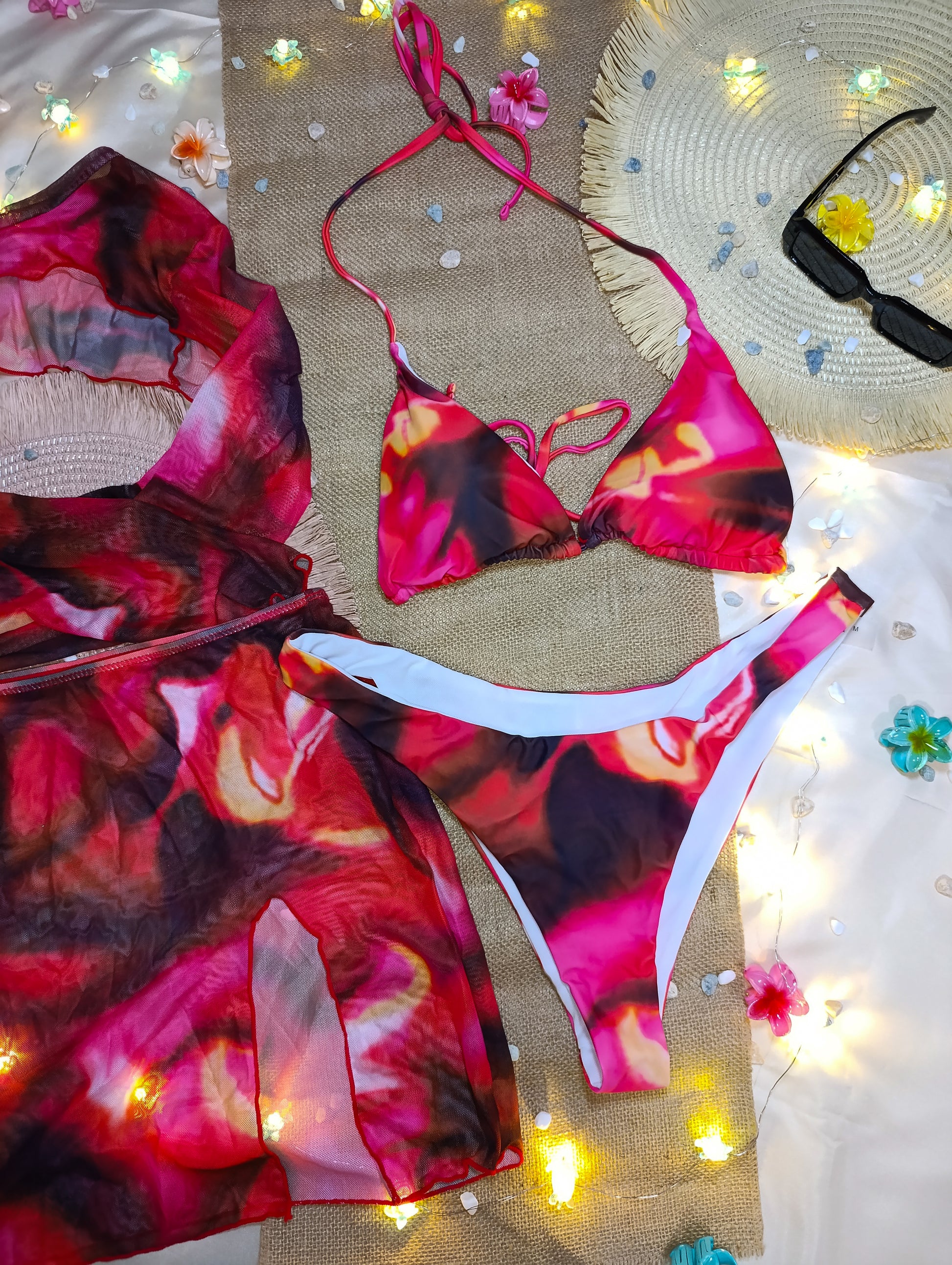 🎨 Estampado artístico en tonos rosados, rojizos y oscuros que evocan el fuego del mar al atardecer.